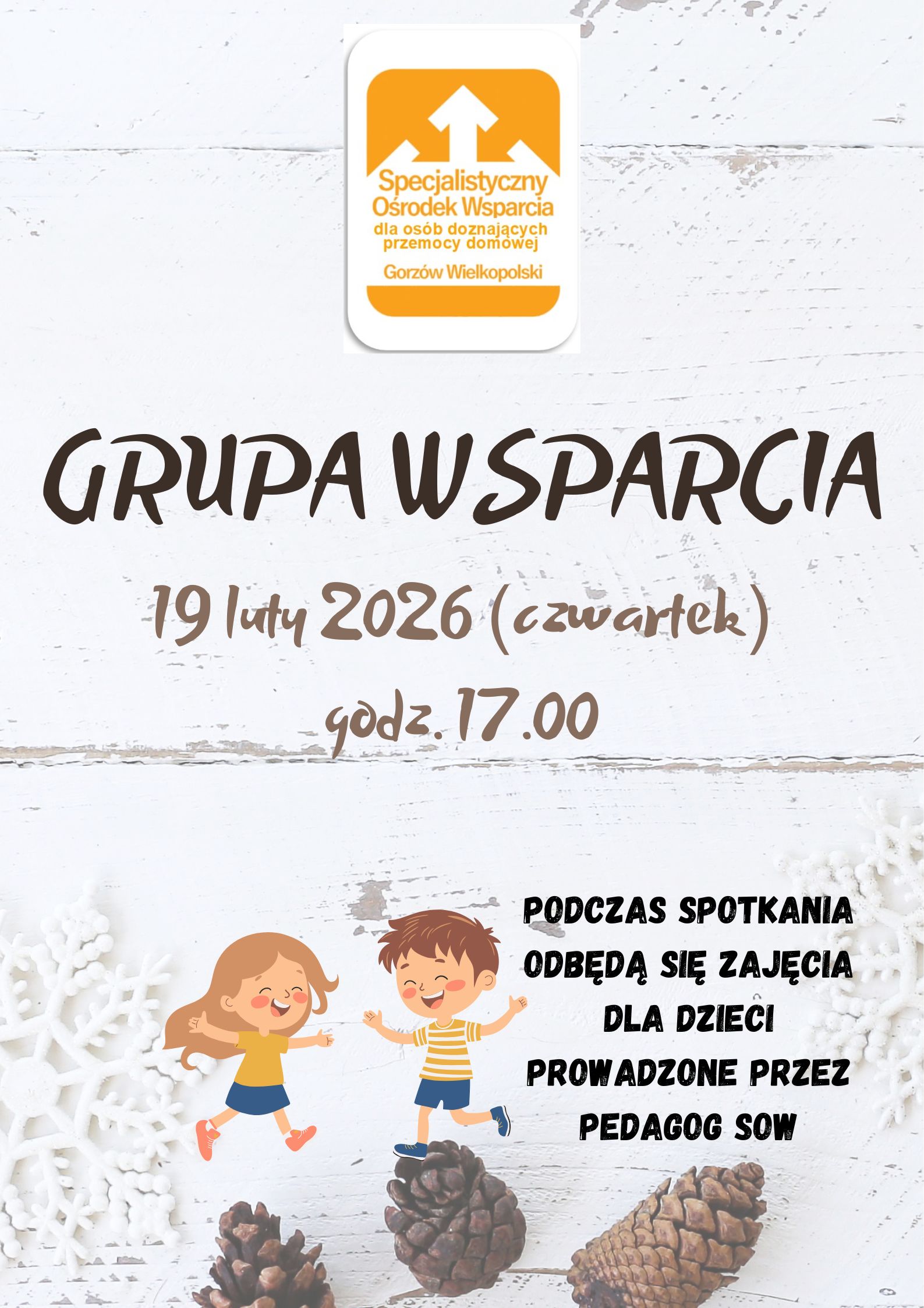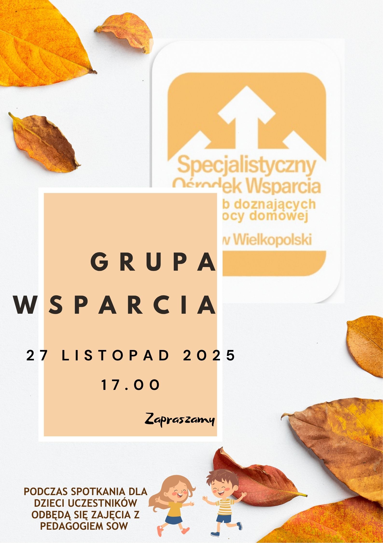 Zapraszamy na listopadowe spotkanie Grupy Wsparcia, które odbędzie się 27 listopada 2025r. o godz. 17.00. Podczas spotkania, dla dzieci uczestników, odbędą się zajęcia z pedagogiem SOW